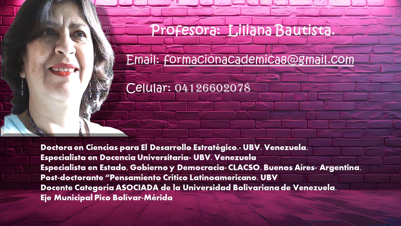 Docente: Fabiola Bautista. Dra. en Antropología. Msc en Etnología. Especialista en Patrimonio Histórico y Natural. Lic. en Historia del Arte. Diplomado en Educación Universitaria. Diplomado en Legado del Comandante Hugo Chávez.